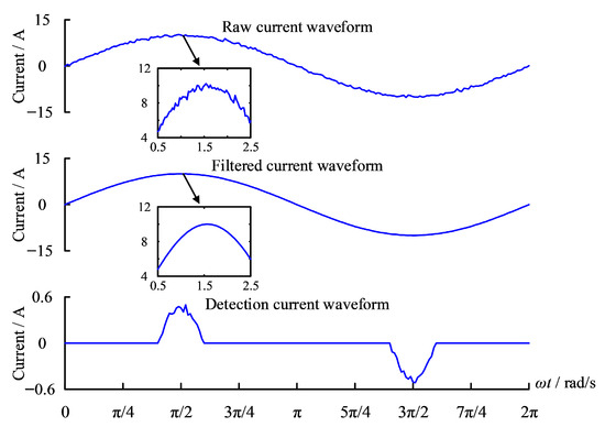 As shown in Figure 4, the current waveform with added noise contains significant spikes, which would be mistakenly identified as peaks or valleys if peak–valley detection was performed directly. After filtering by mathematical morphology, the current waveform becomes smoother. The filtered waveform maintains monotonicity on both sides of the peak or valley moment, allowing the peak–valley detection algorithm to effectively identify the peaks and valleys. The detection current exhibits abrupt changes near the peak or valley moment while remaining zero at other times.