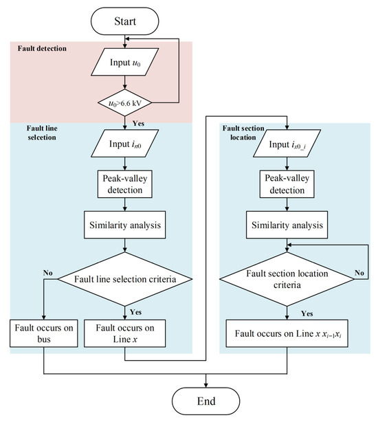 - Fault line selection criteria. If the similarity polarity of Line x is opposite to that of Line 1, the line is judged as a fault line, and enter step 3. If the similarity polarities of all lines are the same, it is judged as a bus grounding fault; if the similarity polarities of other lines are opposite to that of Line 1, Line 1 is judged as a fault line.