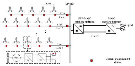 The existing offshore wind power systems are shown in Figure 1: As shown in Figure 1c, the all-DC wind farm features complex topology and constitutes a DC system with high-density power electronics devices. Consequently, compared to the AC collection and AC transmission scheme in Figure 1a and the AC collection and DC transmission scheme in Figure 1b, it exhibits low-inertia characteristics that enable extremely rapid DC fault propagation, accompanied by swift-rising high-magnitude fault currents capable of severe infrastructure damage [19]. Within this topology, multiple wind turbines are connected to the same collection line at intervals (the single capacity of permanent magnet direct-driven wind turbines is generally 10 MW or more [20]), multiple collection lines are connected to the same DC bus, and the offshore distance is long, so it is difficult to maintain the submarine cables. Adopting the protection and maintenance strategy of prolonged de-energization awaiting repairs, common in the first two topologies, for all-DC wind farms would result in significant economic losses, particularly in large-scale offshore applications. Therefore, it is urgent to study and solve the problem of protection and fault localization of offshore all-DC wind farms.
