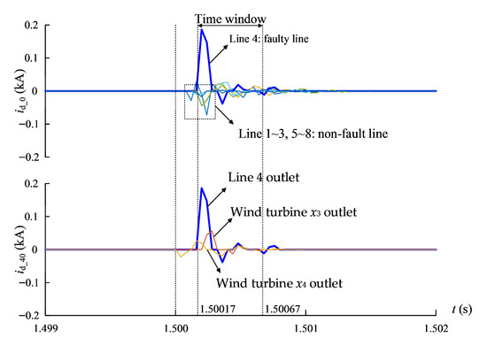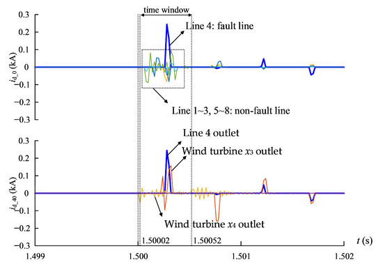 - Collect the transient zero-mode current ix0_i (i = 1, 2, …, 5) at the outlet of each wind turbine on the fault line and the transient zero-mode current ix0_0 at the outlet of fault line, use the mathematical morphology algorithm to detect the peak-to-valley waveform, and select a time window to analyze the similarity of the detection current, taking the detection current of the outlet of the fault line as a reference.