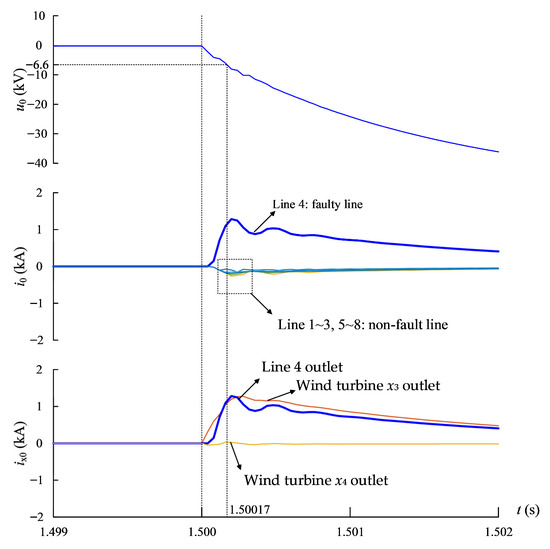 As shown in Table 7 and Table 8 and Figure 12 and Figure 13, it is noted that when a high-impedance SPG fault occurs in the system, the waveform characteristics of the fault electrical quantities differ significantly from those observed in simulation case 1 and simulation case 2. The bus zero-mode voltage after the fault exhibits a more gradual variation trend. Nevertheless, the proposed fault localization method initiates at t = 1500.17 ms; i.e., it still triggers before the zero-mode current of the line reaches its first peak. The zero-mode currents at the outlets of all lines and those at the wind turbine outlets on the fault line no longer exhibit decaying sinusoidal signals, and their amplitudes decrease. However, the polarity relationships remain unchanged. Consequently, the proposed scheme can still accurately identify the fault section.