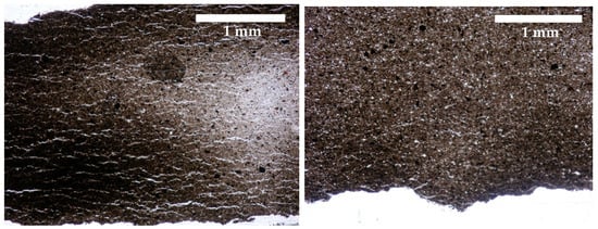 Micromorphological observations provided the clearest evidence of pedogenic change. Compared with the compact laminar structure of untreated fine-sized residual coal (Figure 3), all treatments developed a crumb structure in the 0–5 cm layer (Figure 4, Figure 5, Figure 6, Figure 7 and Figure 8), indicative of soil formation processes []. Organic residues, both amorphous and lignified, were well incorporated with mineral particles, supporting active biological processing. Treatment differences were most evident in aggregate size and distribution: higher manure rates (60 mm) produced larger aggregates, often containing undecomposed material, while lower rates (25 mm) resulted in smaller, more uniformly mixed aggregates. The latter configuration increased specific pore perimeter by 4–5 times (Table 4), enhancing reactive surface area for water–air exchange and nutrient cycling.