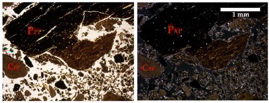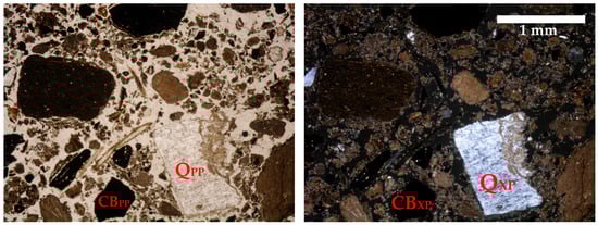 Observation of the composition of a layer (0–5 cm) where 25 mm of semi-liquid manure was applied (with straw) nine years ago. The image on the left corresponds to the observation under PP light, whereas the right image corresponds to the observation under XP light. Quartz aggregates (Q) and coal aggregates (CB) were observed.