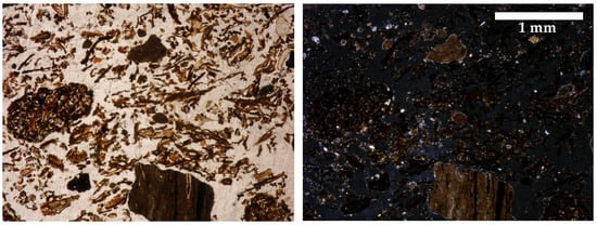 Micromorphological techniques were used to study soil organic matter distribution and porosity. In each plot, one prism (6 cm depth × 9 cm thick × 19 cm long) from the middle of each replicate plot was sampled following []. One prism was also obtained from the basin where the fine-sized residual coal was stored. The prisms were air-dried and then placed in a container to be impregnated with polyester resin. The resin polymerized and produced a compact block that preserved the natural soil structure. Finally, once the sample was fully solidified, thin sections (5.5 cm high, 13 cm wide and 30 μm thick) were obtained. The sampled thin sections were described according to the terminology and concepts developed by []. An Olympus BX51 polarizing petrographic microscope (Evident, Tokyo, Japan) was used. Petrographic microscopes allow us to observe the samples in transmitted polarized light (PP) and under cross-polarized (XP) light by inserting a polarizer perpendicular to the one used in PP between the eye and the sample. The colors observed under XP light are referred to as interference colors, which are used for the interpretation of the anisotropic, non-opaque components.