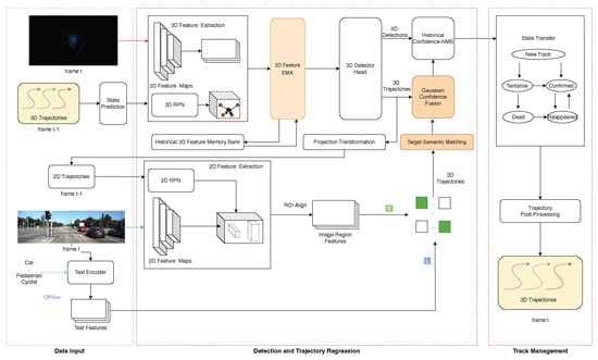 In this section, we present the proposed Text-Guided 3D Multi-Object Tracking framework, a novel approach that integrates Vision-Language Models (VLMs) into the YONTD architecture to address key challenges in 3D MOT. Our framework, illustrated in Figure 2, consists of several innovative components designed to enhance detection, tracking, and trajectory management. The overall architecture maintains an end-to-end structure, enabling seamless integration of semantic information without requiring additional training. The framework begins with LiDAR point cloud data [41] as input, which is processed by a 3D detector (embed the 3D Feature EMA module) to generate the current frame’s 3D trajectory states [42,43]. These 3D trajectories are then projected onto the 2D image plane, where the 2D trajectories and the current image frame are fed into a multimodal detector to obtain trajectory scores and semantic features [44]. The Target Semantic Matching Module is employed to filter out false positives by analyzing the semantic information of candidate trajectories. Subsequently, the Gaussian Confidence Fusion Module fuses the 2D and 3D historical trajectories, assigning weights based on a Gaussian distribution to compute the final trajectory score, which guides the Non-Maximum Suppression (NMS) process to determine the final trajectories and associations for the current frame. In the Trajectory Management Module, we adopt the strategy from DeepFusionMOT [45]. Each of these components is detailed in the following subsections.