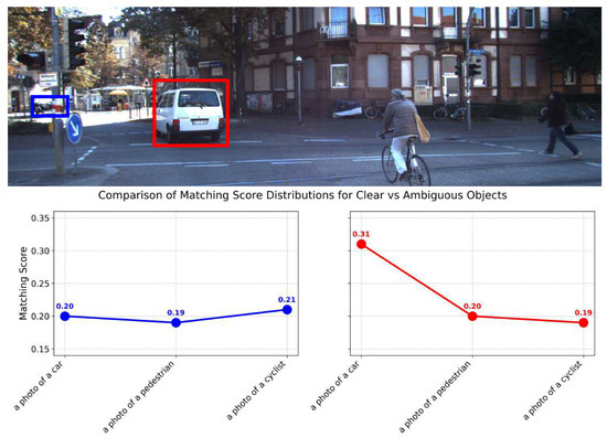 To address these limitations, we focus on enhancing the alignment between image region features and textual features. Specifically, the matching score matrix is computed to identify the most semantically relevant textual description for each image region. Through extensive experimentation, we observe that when the objects within a region are clear and easily identifiable, the matching score distribution across textual descriptions exhibits significant discriminability. Conversely, in cases of ambiguity or occlusion, the distribution becomes notably smoother, as demonstrated in Figure 3. Building on these insights, we propose a Target Semantic Matching Module (TSM), which quantifies the uncertainty of each region’s semantic alignment by calculating the variance of its matching score distribution, denoted as . To further incorporate the influence of 3D detection confidence, we define the TSM score for each region as follows: