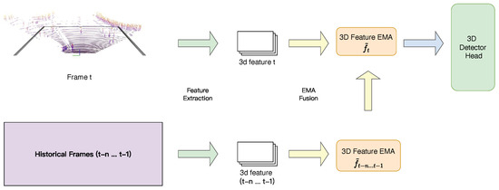 Workflow of 3D Feature EMA. The object is consistently detected from frames to , but missed at frame t. By leveraging 3D F-EMA, historical feature information is fused into the current frame t, enhancing the performance of the 3D detector.