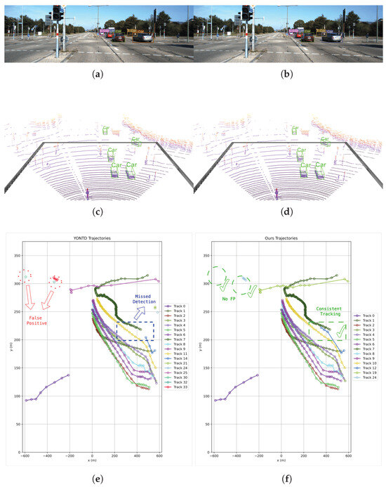 Comparison of bird’s-eye-view trajectories between YONTD and our TG3MOT method. (a,b) show the input frames processed by YONTD and TG3MOT, respectively. (c,d) show the corresponding 2D tracking results, while (e,f) show the bird’s-eye-view trajectories. Annotations highlight the key differences: Red circles in (e) indicate false-positive trajectories (ghost tracks) generated by YONTD, which are successfully eliminated by our method, as shown in the corresponding areas of (f). Navy blue boxes mark instances of missed detections and track fragmentation in (e), while our approach (f) maintains full, continuous trajectories (green checkmarks). Overall, our method demonstrates superior performance with significantly reduced false alarms and more robust, consistent tracking.