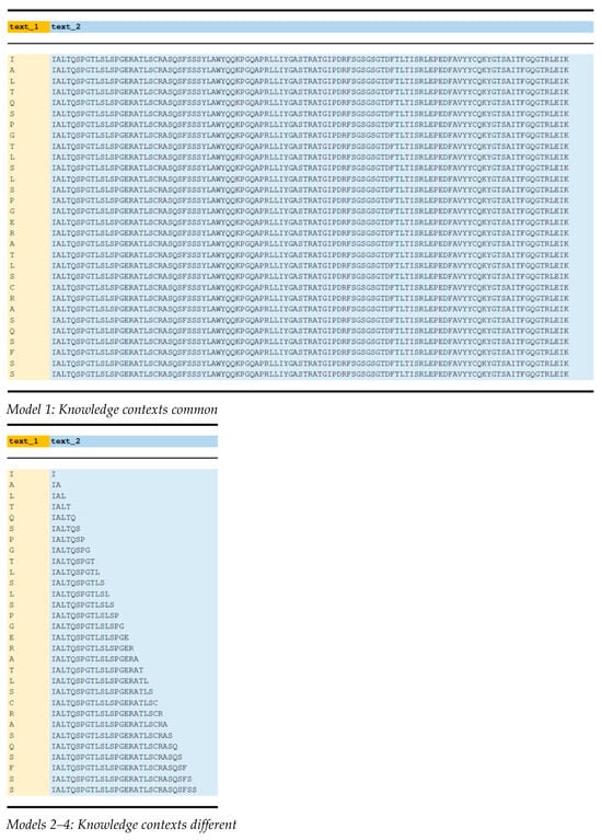 Knowledge contexts: common vs. different. Legend: The knowledge contexts of Model 1 were common among all amino acids within each BCR chain, while the knowledge contexts of Models 2–4 were different for different amino acids within each BCR chain. Here, the knowledge context of an amino acid consisted of its predecessor amino acids.