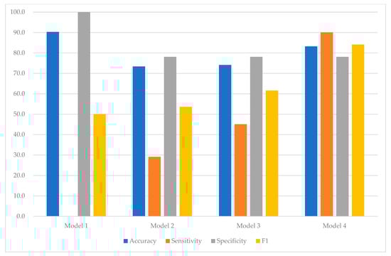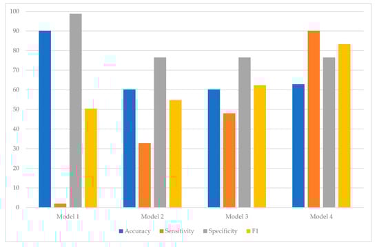 Meanwhile, the test-set accuracy, sensitivity, specificity and F1 of Model 2 (an intermediate model with different knowledge but no oversampling) were 73.4, 29.1, 78.1 and 53.6, correspondingly. Likewise, the respective test-set accuracy, sensitivity, specificity and F1 of Model 3 (an intermediate model with different knowledge and weak oversampling) were 74.1, 45.1, 78.1 and 61.6. Models 2–4 demonstrated better sensitivity and F1 outcomes compared to Model 1, i.e., 29.1, 45.1, 90.1 vs. 0.0 for sensitivity, 53.6, 61.6, 84.1 vs. 50.0 for F1.