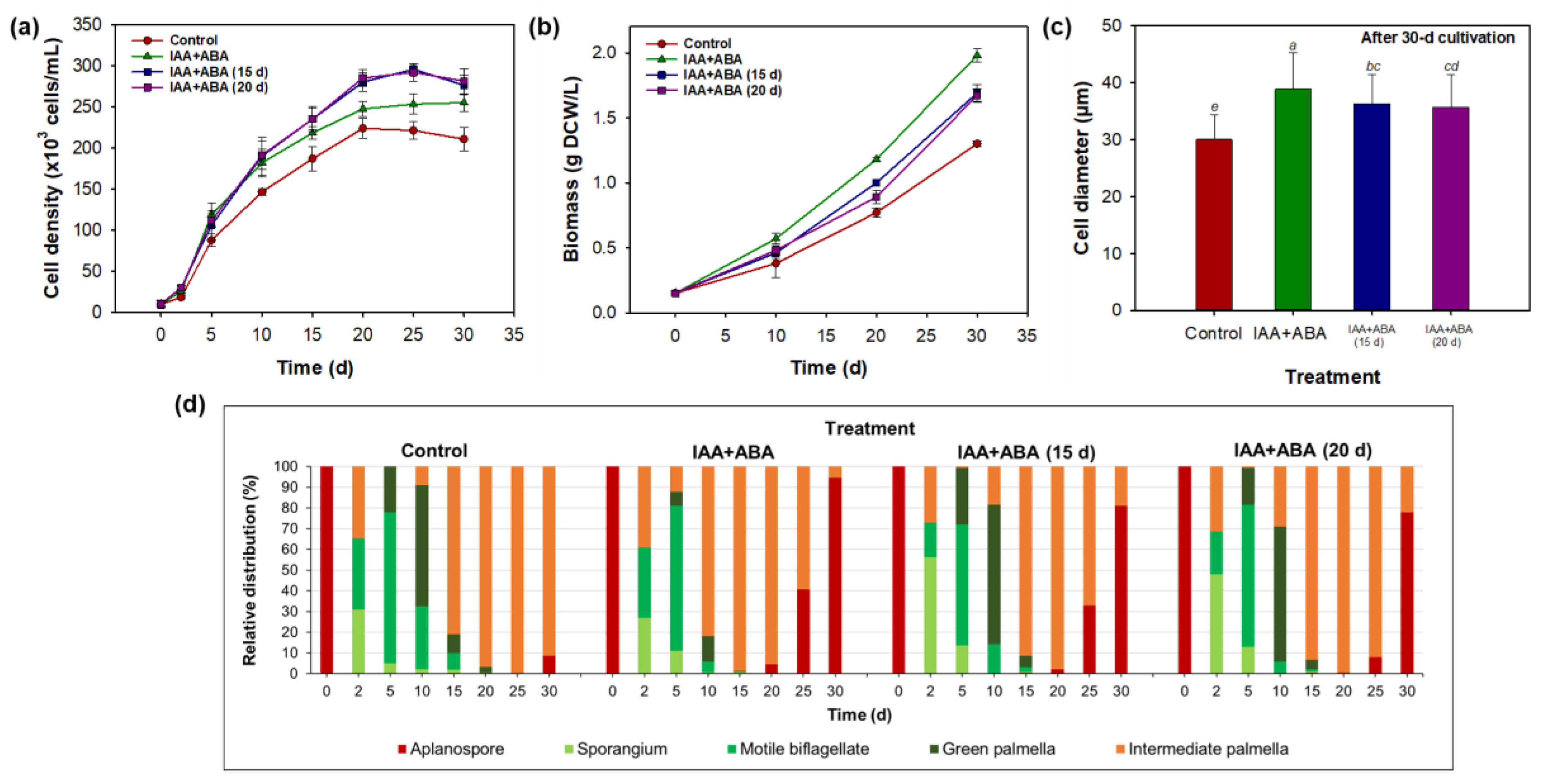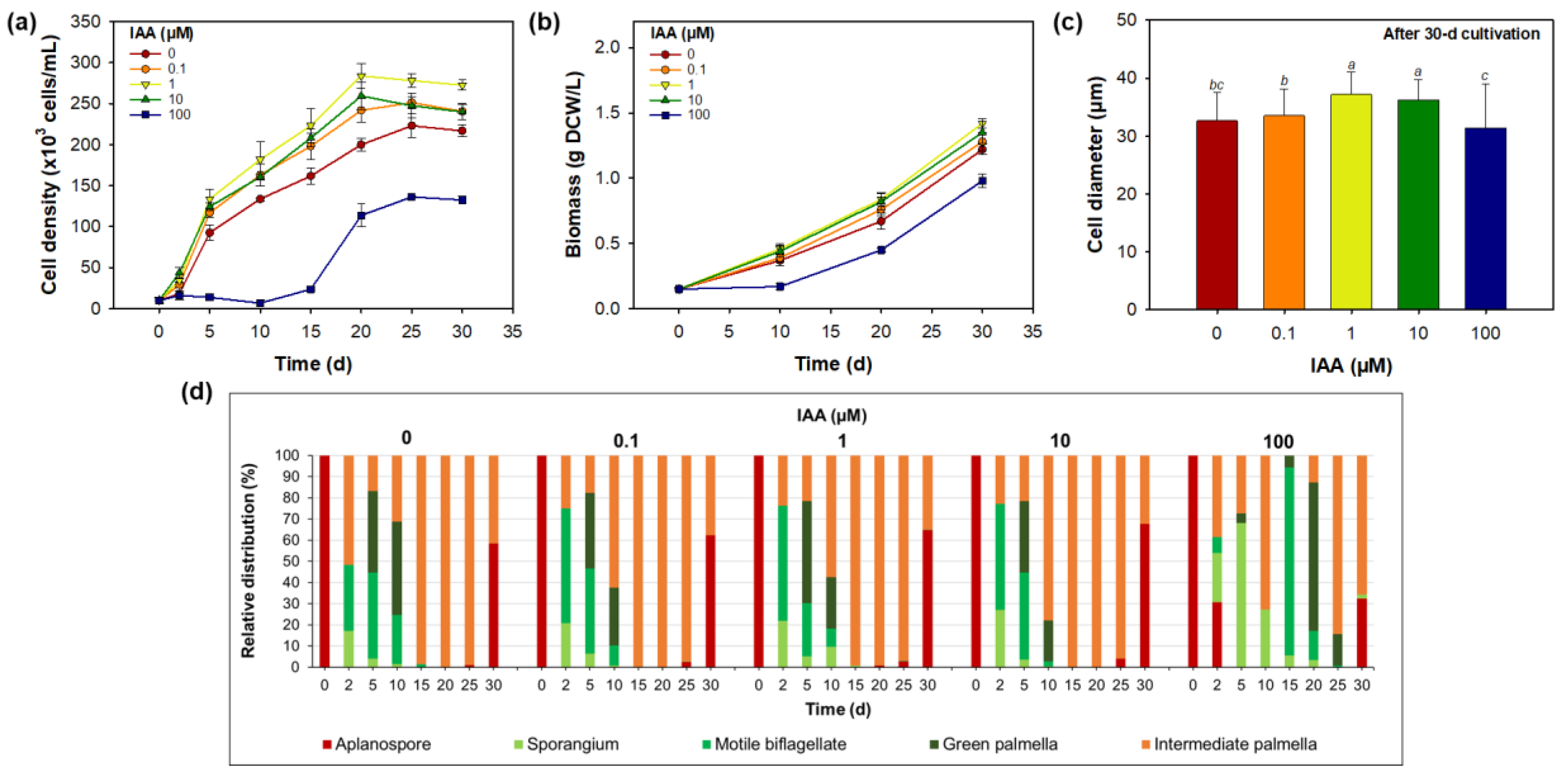 - Lee, C.; Jeon, M.S.; Kim, J.Y.; Lee, S.H.; Kim, D.G.; Roh, S.W.; Choi, Y.-E. Effects of an auxin-producing symbiotic bacterium on cell growth of the microalga Haematococcus pluvialis: Elevation of cell density and prolongation of exponential stage. Algal Res. 2019, 41, 101547. [Google Scholar] [CrossRef]
