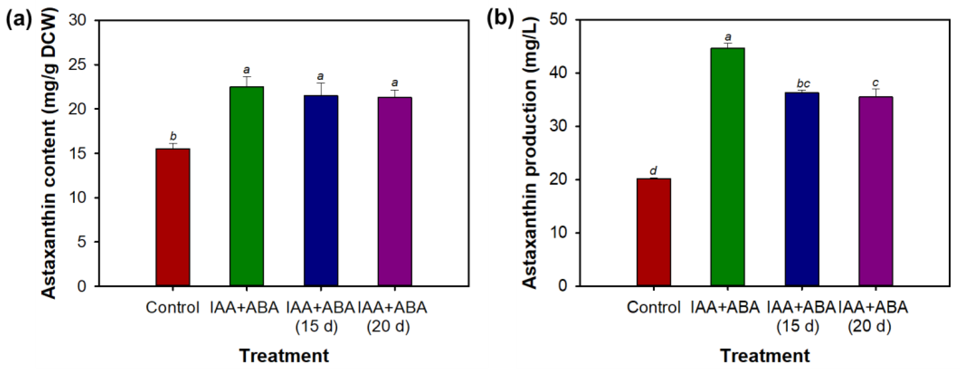 Chicago/Turabian StyleMahadi, Rendi, You-Kwan Oh, Laxmi Priya Sathiyavahisan, Aditya Lakshmi Narasimhan, Eui-Jin Kim, and Ja Young Cho. 2025. "Enhancement of Co-Production of Astaxanthin and Total Fatty Acids in Haematococcus lacustris by Combined Treatment with Exogenous Indole-3-Acetic Acid and Abscisic Acid" Applied Sciences 15, no. 18: 10136. https://doi.org/10.3390/app151810136