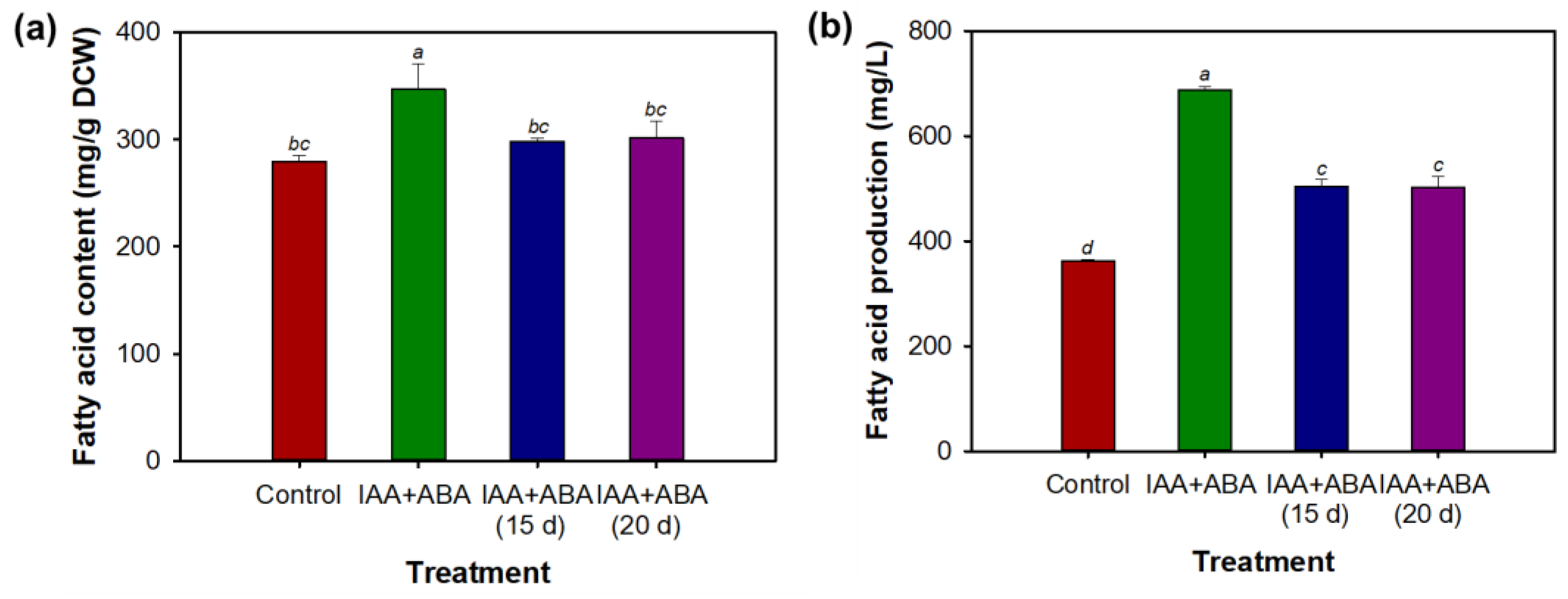 3.5. Combined Effect of Indole-3-Acetic Acid and Abscisic Acid on Fatty Acid Content and Production