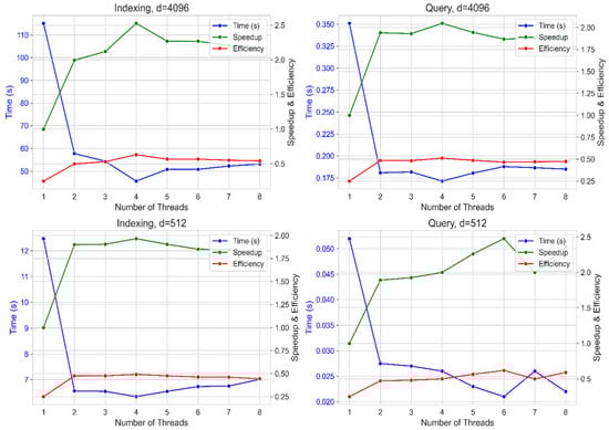 Dependence of execution time, speedup, and efficiency of the SNN implementation on the number of threads for the indexing and query phases at different embedding dimensionalities (OpenMP, N = 105,864).