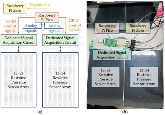 The proposed DLPPMS adopts a platform-type architecture and comprises a Raspberry Pi Zero for data processing, a Raspberry Pi Pico for sensor control, two 12 × 24 resistive pressure sensor arrays, with one assigned to the left foot and the other to the right foot, seamlessly combined into a 24 × 24 pressure-sensing matrix, a custom signal acquisition circuit, and a display module, as illustrated in Figure 1. Figure 2 presents a schematic illustration of a participant standing on the system during measurement.