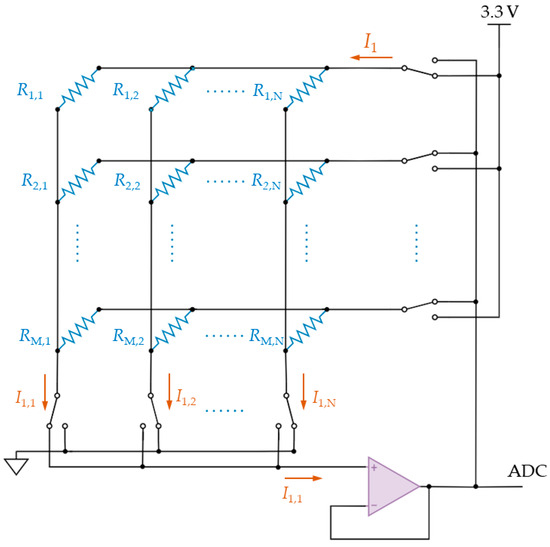 Schematic diagram of the signal acquisition circuit designed for sequential row–column scanning of the resistive sensor array and an analog-to-digital converter (ADC) for subsequent processing in the deep learning-based plantar pressure measurement system (DLPPMS).