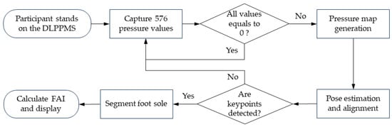 Workflow of the proposed deep learning-based plantar pressure measurement system (DLPPMS), illustrating the sequential process from plantar pressure data acquisition to foot arch index (FAI) estimation.