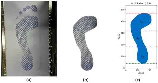 To assess the validity of the proposed DLPPMS, this study employs the FIM method as a comparative reference standard. The FIM procedure utilizes the VERS MP-5 pressure-sensitive footprint device to capture high-resolution static plantar images, providing a reliable basis for FAI estimation. In the FIM-based measurement procedure, the participant stands on one foot on the MP-5 pressure-sensitive platform, ensuring full plantar contact with the sensing plate to generate a static plantar pressure map, as shown in Figure 11a. After image acquisition, researchers manually delineate the plantar region by tracing the boundary of the visible sole, excluding the toes and surrounding background, and manually aligning the image, as illustrated in Figure 11b. The refined contact region is then used to compute the FAI, as depicted in Figure 11c. The FAI values obtained through the FIM method are compared with those derived from the DLPPMS to evaluate measurement accuracy, consistency, and suitability for clinical and research applications.