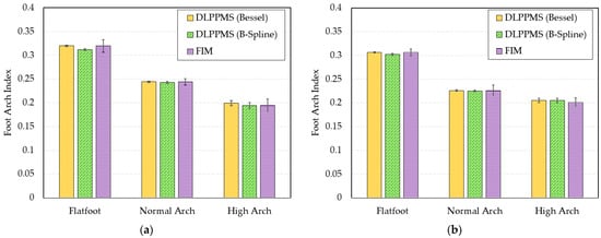 Bar plots of foot arch index (FAI) values for (a) the left foot and (b) the right foot across three foot types, obtained using the deep learning-based plantar pressure measurement system (DLPPMS) with Bessel interpolation, the same system with B-spline interpolation, and the footprint imaging measurement (FIM) method. Error bars represent the standard deviation from 10 repeated measurements.