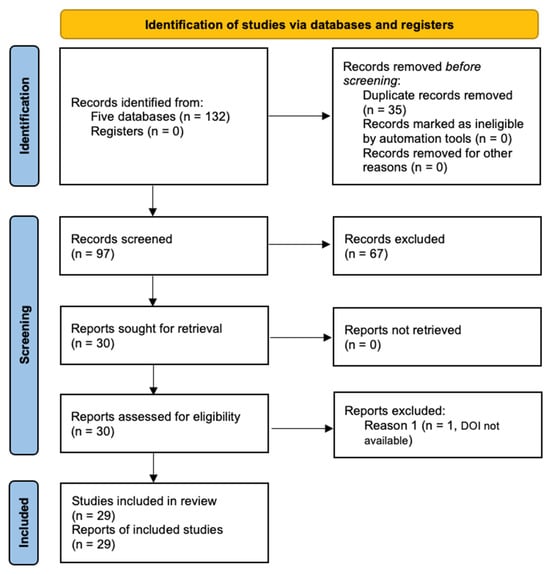 The PRISMA framework (Figure 1) was used for the screening procedure. The initial search identified 132 articles. After removing 35 duplicates, the abstracts of 97 articles were reviewed. Based on abstract screening, 67 articles were excluded due to irrelevance. A comprehensive review of 30 articles was then conducted to assess their eligibility, resulting in the final selection of 29 articles (one article’s DOI was unavailable) that met all criteria and were included in the analysis.