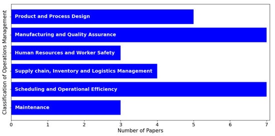 In Industry 4.0, manufacturers embrace cutting-edge technologies to enhance efficiency, reduce waste, and support data-driven decision-making. According to Heizer and Render in their book on Operations Management [], manufacturing company operations can be classified into key areas such as product and process design, manufacturing and quality assurance, location selection and layout design, human resources and worker safety, supply chain, inventory and logistics management, scheduling and operational efficiency, and maintenance. An emerging trend within this domain is the integration of the DT-CV combo, which enables advanced capabilities such as virtual prototyping [], defect detection [], hazard identification [], supply chain optimization [], real-time production monitoring [], and predictive maintenance []. The growing research interest in this integration is reflected in the increasing number of academic publications, as illustrated in Figure 2. Furthermore, Figure 3 illustrates the distribution of research papers across operations management classes, highlighting the key focus areas where the DT-CV combo is applied within industrial operations and manufacturing.