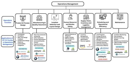 The DT-CV combo is starting to be used in real-world industrial applications. The DT-CV adoption drivers of cost reduction (lowering the redesign costs and need for fewer physical prototypes), shorter time-to-market (faster development cycles), and improved operational agility (DT-CV combo enables real-time monitoring and iterative optimization) can give a competitive edge to the early adopters as they can be more nimble to meet the customer need in a time and cost sensitive market. Figure 4 shows companies adopting this combo in their operational functions. For example, Siemens [], GE Vernova [], Dassault Systèmes, and Konecranes use the DT-CV combo in areas including product and process design, manufacturing, and quality assurance []. Konecranes uses the DT-CV combo in their “Smart Factory,” which helps companies in their daily production and maintenance operations. From a production point of view, important information on machine downtimes and their duration is obtained and then used to address the causes of production disruptions []. Other companies like NVIDIA and Addepto (now part of Grape Up) support process design and improvement, real-time production monitoring, and defect detection [,] through systems enabled by the DT-CV combo. For instance, NVIDIA’s Isaac Sim—built on the Omniverse platform—allows companies like Amazon to generate photorealistic synthetic images for training CV models used in warehouse and factory robotic operations [].