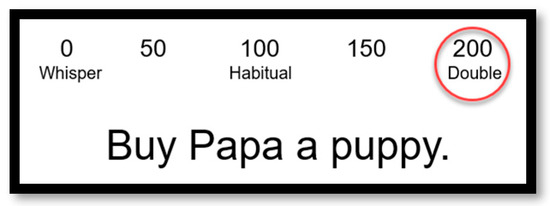 The sentences were produced 10 times each in two loudness conditions: Habitual and Loud. The stimuli were presented on a computer screen with instructions to say the phrase in either their conversational loudness level (i.e., Habitual) or twice as loud as conversational (i.e., Loud). For the Loud condition, a direct magnitude estimation (DME) procedure previously described in a study of tongue–palate contact pressures in adults without speech deficits was used [26]. The instruction was to consider habitual loudness to have a value of 100, followed by the prompt to double their loudness so that the sentence was read at a loudness equivalent to a value of 200 (Figure 1). The target loudness level for a given production was indicated by altering the displayed text to show the intended loudness condition. Participants were not required to precisely double their loudness. Rather, the intent was to encourage louder speech, such as in LSVT LOUD® and SPEAK OUT!® treatments.