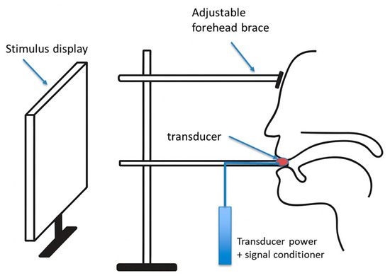 The instrumentation has been described previously [28]. Briefly, an Entran EPI-BO transducer (Entran, Fairfield, NJ, USA) was used to measure BCP. This is a piezoresistive pressure sensor with a pressure range from 0 to 68 kPa and a high-frequency response, making it suitable for dynamic pressure measurements such as articulation contact pressure. The small sensing surface (2.58 mm), slim profile (0.45 mm thick), and light weight (0.085 g) with a temperature compensation module allow it to be placed between the lips without altering articulation. This transducer was mounted on a 0.5 mm acrylic strip held by an adjustable clamp so that the transducer was positioned on the lower lip of the participant. The transducer was placed in midline with the sensing surface against the lower lip (Figure 2). Positioning was such that the full sensing surface of the transducer was covered by the lips during closure for bilabial phoneme production. The transducer signal was amplified and routed to a PowerLab 8 digital system (ADInstruments, Colorado Springs, CO, USA) for signal display and recording using LabChart 8.1.16 software (20 kHz digitization, 16-bit precision; ADInstruments). The signal was low-pass filtered at 50 Hz to remove any voicing signal that might be present in the pressure curve, and a peak-picking routine in LabChart marked the maximum BCP signal excursion corresponding to the phoneme of interest. An audio signal was recorded in the second channel of LabChart using an AKG C410 headset microphone. With concurrent display of the BCP and audio signals, researchers could isolate the experimental phoneme of interest and play back the audio to confirm the production for measurement.
