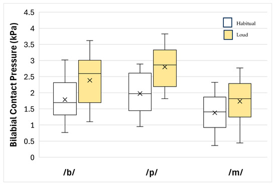 Box-and-whisker plots for bilabial contact pressure (BCP) for each phoneme in the two loudness conditions. X = mean, line inside box = median, box = interquartile range, whiskers = range, kPa = kilopascal.