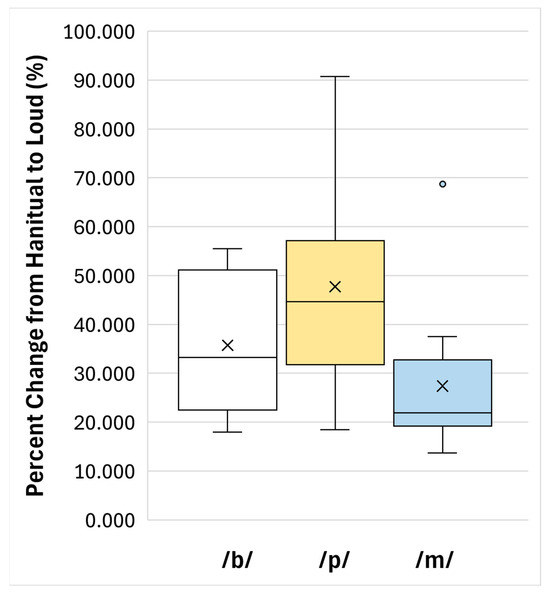 Box-and-whisker plots of the percent change in BCP in the Loud condition relative to the Habitual condition for each of the experimental phonemes. Bars = interquartile range; line within bars = median; X within bars = mean; whiskers = minimum and maximum; dots = outliers.