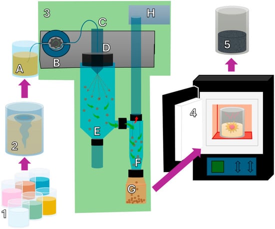 The high-entropy perovskite La(Co0.2Mn0.2Fe0.2Ni0.2Cu0.2)O3 was synthesized via spray drying of an aqueous solution of mixed metal salts followed by calcination. A schematic representation of the synthesis process is shown in Figure 1. To prepare the mixed-salt solution, metal nitrates with a concentration of 1 mol dm−3 were used. Details on materials and their sources are given in Supplementary Data. The concentrations of the prepared solutions were verified using inductively coupled plasma optical emission spectrometry (ICP-OES, Thermo Scientific iCAP 6200 DUO, Waltham, MA, USA). The precursor solutions were mixed in volume ratios corresponding to the stoichiometric molar ratios required for the target perovskite composition.