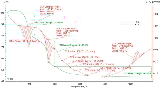 Differential thermal analysis and thermogravimetric analysis (DTA and TG) were performed using a simultaneous DTA–TG analyzer (NETZSCH STA 449 F3 Jupiter, Selb, Germany) in a synthetic air atmosphere (20 mL min−1), with an additional protective Ar flow (20 mL min−1). Measurements were carried out from room temperature (20 °C) up to 1200 °C at a heating rate of 10 °C min−1.