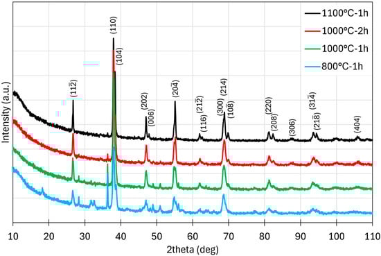 To evaluate the phase composition of the synthesized materials at different calcination temperatures, X-ray diffraction (XRD) measurements were carried out (Figure 3). Phase analysis of the diffraction data revealed that a single-phase perovskite structure, comparable to LaMnO3 (COD #1542144), was obtained only for the sample calcined at 1100 °C for 1 h. Rietveld refinement of this sample confirmed a trigonal structure with space group Rc and refined lattice parameters a = 5.508 Å and c = 13.265 Å (in the conventional hexagonal setting). The corresponding refinement profiles are provided in the Supplementary Information (Figure S1), and the refined structural parameters are summarized in Table S4. In contrast, samples calcined at lower temperatures exhibited multiphase compositions, mainly containing phases with orthorhombic symmetry. Due to the structural complexity and peak overlap, these secondary phases could not be unambiguously indexed.