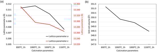 Comparison of the main perovskite phase across all samples revealed slight differences in lattice parameters, reflected in the shifts of the main diffraction peaks (30–40°). Figure 4a,b shows the evolution of lattice parameters (a and c) and unit cell volume as a function of calcination temperature and dwell time. With increasing calcination temperature, both the lattice parameters and the unit cell volume decreased. The most pronounced variation occurred in the c parameter (average change ~0.9 Å), while changes in the a parameter were on the order of thousandths of an angstrom. This trend can be attributed to the incorporation of different cations into the perovskite structure. At higher calcination temperatures, enhanced cation diffusion promotes the transformation of secondary phases present at lower temperatures into the single-phase perovskite. This process is governed by both temperature and dwell time, leading to a clear correlation between calcination conditions and the fraction of the perovskite phase.