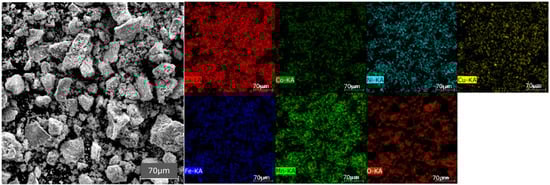Microscopic analysis revealed that the particle morphology was fine-grained and heterogeneously distributed, consisting of loosely aggregated fragments ranging in size from a few micrometers up to several hundred micrometers (Figure 5). The particle surfaces appeared markedly irregular and rough. The intended chemical composition was equimolar; however, EDS analysis indicated a quasi-equimolar ratio of the transition metals (Table 1), which is within acceptable limits. Furthermore, EDS mapping confirmed a homogeneous elemental distribution across the analyzed area, demonstrating uniform dispersion of the constituent elements.
