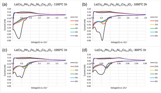 To evaluate the electrochemical performance of the synthesized high-entropy perovskite oxides, cyclic voltammetry (CV) measurements were performed. For the sample calcined at 1100 °C for 1 h (Figure 6a), the first cycle exhibited a small cathodic peak at ~0.75 V, followed by a pronounced reduction peak at ~0.5 V, which is commonly associated with the formation of the solid electrolyte interphase (SEI) layer []. The corresponding anodic scan did not show a distinct peak but rather a broad anodic region between 0.2 and 1.0 V, indicating a continuous process of lithium extraction. In subsequent cycles, the initial reduction features diminished significantly, suggesting stabilization of the SEI layer. The close overlap of CV curves from the second to the sixth cycle demonstrates good electrochemical reversibility and cycling stability.