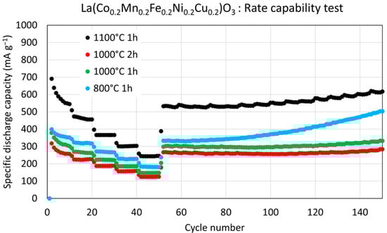 After the initial decline, the capacities remained relatively stable at each applied current density. When the current density was returned to the initial value of 100 mA g−1 in the regeneration step, all samples showed capacity recovery, with the 1100 °C sample nearly regaining its initial stable value. Notably, the discharge capacities of this sample were approximately twice those of the materials prepared at lower calcination temperatures at each corresponding current density.