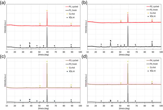 Post-mortem XRD analysis of the electrodes after six CV cycles revealed a pronounced phase transformation (Figure 9). The characteristic diffraction peaks of the main perovskite phase disappeared, while a broad amorphous feature emerged along with the diffraction peaks of the copper-foil current collector. These observations indicate that the material undergoes a conversion-type reaction in which oxide phases are reduced to metallic states during discharge and re-oxidized upon charging.