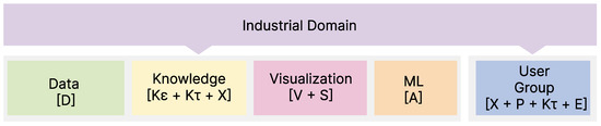 Functional building blocks that reflect the categorization schema of our survey. The category industrial domain influences all elements of the KAVA model [11]. The building block data covers [D] in the KAVA model, and our building block knowledge covers explicit [] and tacit knowledge [] and externalization [E]. The next building block for the survey is visualization, which covers [V] and the specification [S]. The building block machine learning is represented as [A] in the KAVA model. The building block user group covers exploration [E], tacit knowledge [], perception [P], and externalization [X].