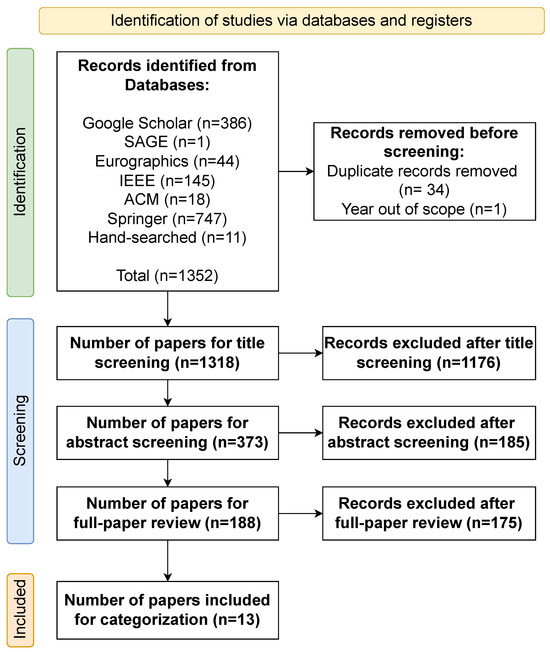 After completing the screening process, 13 papers were selected for fine-grained categorization. The analysis was structured around six main entity groups, as illustrated in Figure 2 and Table 2, namely data [D] (as defined by Schreck et al. [3]), knowledge [] (as in Federico and Wagner et al. [11]), and visualization [V, S] (according to the Data Visualization Catalogue [32]). In addition, we reported on visualization techniques that are not covered by the Data Visualization Catalogue because they are described in the source, which are labeled “as reported” in Table 2.