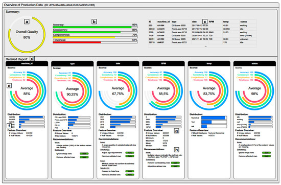 Data quality dashboard of Behringer et al. [42,46]: (a) overall quality score with color coding; (b) breakdown by dimension (accuracy, completeness, consistency, timeliness); (c) sample of raw records for context; (d) feature-level quality overview; (e) per-feature dimension scores; (f) value distribution histograms; (g) key statistical indicators (e.g., null counts, min/max, averages); (h) recommended remediation actions for identified issues.