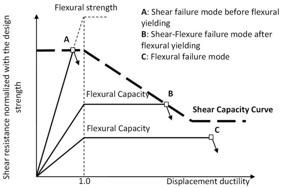 Reinforced concrete (RC) columns play a critical role in the structural integrity of buildings, as their failure can result in severe and disproportionate impacts on the entire system. The behavior of RC columns subjected to combined axial load, shear, and flexure has been the focus of extensive research for decades. For flexural behavior, methods such as sectional analysis or fiber modeling in a one-dimensional stress field can effectively estimate ultimate strength, yield deformation, and predict flexural failure modes. However, when shear or combined shear–flexure behavior governs the response, sectional analysis alone becomes insufficient. This is because shear force transfer involves complex stress fields that span the entire member, extending to its supports. Figure 1 shows the shear strength degradation models adopted by EN 1998-3 (2005) [] and ASCE/SEI 41 (2007) [], which are used to depict the envelope of resistance curves for RC columns as a function of displacement ductility.