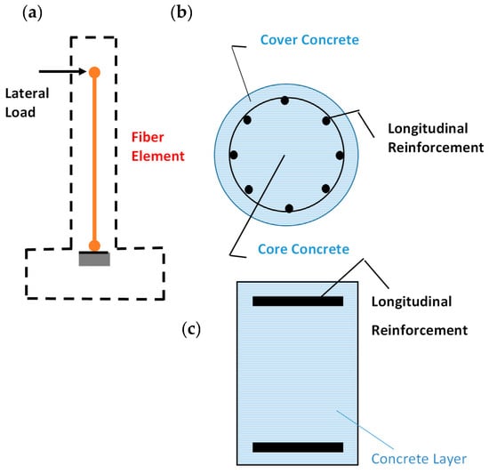 (a) Numerical model for circular and rectangular RC columns failed in flexure in FEDEAS MATLAB toolbox [,,]. (b) Circular section discretization in fibers/layers. (c) Rectangular section discretization in fibers/layers.