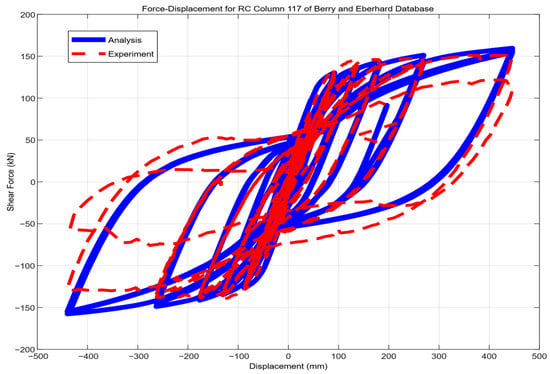 Comparison between numerical and experimental response of circular column failed in flexure (ID#117) (specimen case obtained from the Berry et al. Database 2004 [] and was analyzed herein).
