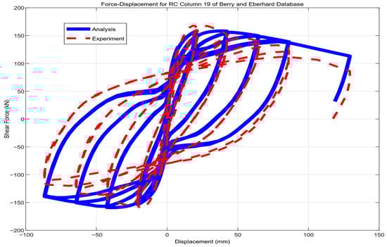 Comparison between numerical and experimental response of rectangular column failed in flexure (ID#19) (specimen case obtained from the Berry et al. Database 2004 [] and was analyzed herein).