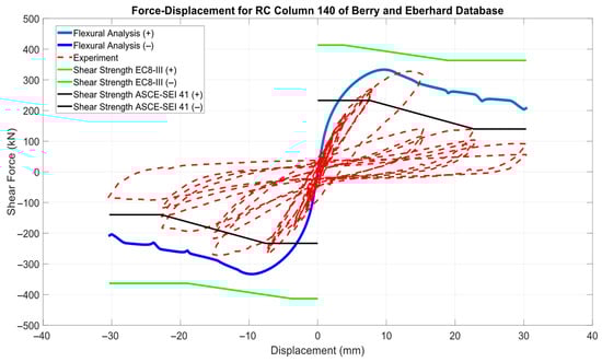 Figure 5 shows a comparison between analytical and experimental responses for a rectangular column (ID#140) that failed in shear. The correlation is notably poor, even regarding the initial stiffness predicted by flexural analysis. This discrepancy is due to the exclusion of deformation effects from reinforcement pullout and shear deformation. It is apparent that only the degrading shear strength model from ASCE/SEI 41 (2007) [] intersects the flexural capacity curve, indicating shear failure caused by shear strength degradation. However, the predicted displacement at which this failure occurs precedes the actual onset of strength degradation observed experimentally. Because not all code provisions correctly predicted the failure mode in this case, the prediction is considered unsuccessful.