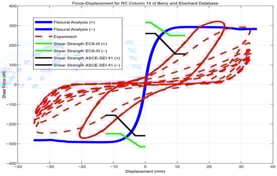 Comparison between numerical and experimental response of circular column failed in shear (ID#14) (specimen case obtained from the Berry et al. Database 2004 [] and was analyzed herein).