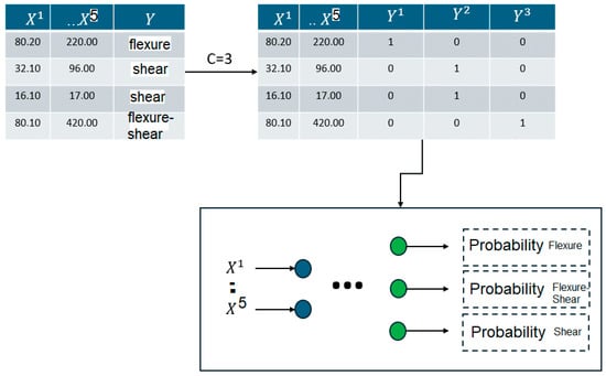 Non-binary classification problem for RC column failure mode prediction with 5 input variables (see Appendix A) and 3 possible values for the classification variable of the output layer (0 for flexure, 1 for flexure–shear, and 2 for shear). The maximum probability defines the final failure mode of the RC column.