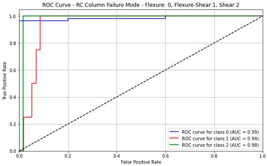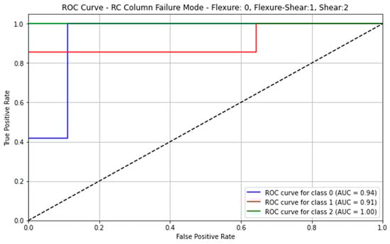The performance metrics for rectangular RC columns are presented below. The ANN model achieved an accuracy of 94% in predicting the actual failure modes of the columns in the test dataset. This accuracy is calculated from Table 5 by dividing the sum of the diagonal elements by the total sum of all elements in the table. Additional performance metrics are provided in Table 6. Furthermore, Table 6 indicates that the model performs better at predicting flexural and shear failure modes than flexure–shear failures. This is understandable, as distinguishing flexure–shear failure is often more complex, even in practical engineering assessments, particularly in seismic structural assessment. When each influencing parameter in the feature data is examined individually, the transverse reinforcement ratio emerges as the most significant factor for the model’s success. This outcome verifies that the model has accurately captured the relationship between all features and the target failure mode, which is essential for building a prediction model based on physically meaningful ML methods []. It is important to note that Table 5 provides a clear explanation of the data illustrated in Figure 8, while Table 6 further clarifies the interpretation of Table 5.