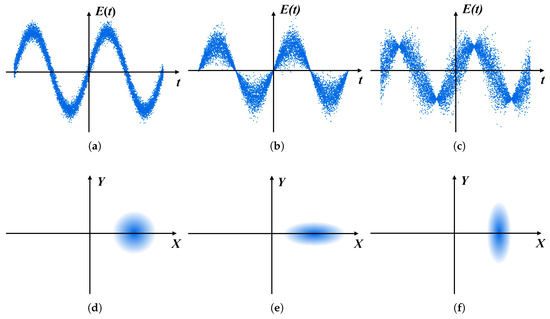 Quantum noise characteristics in time and phase space. (a) Temporal quantum noise of a coherent state (electric field amplitude vs. time). (b) Temporal quantum noise of a phase-squeezed state. (c) Temporal quantum noise of an amplitude-squeezed state. (d) Phase-space representation of a coherent state. (e) Phase-space representation of a phase-squeezed state. (f) Phase-space representation of an amplitude-squeezed state.